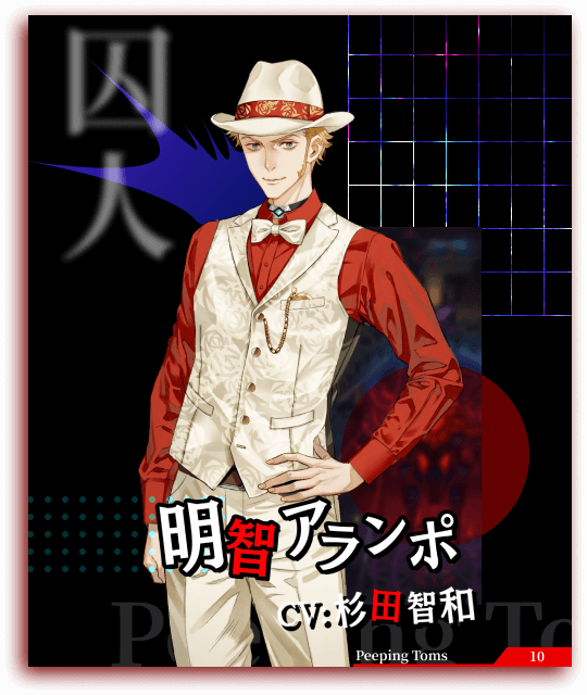 Private detective, alias: Allan Poe Akechi. He claims to be a talented investigator, but his powers of deduction are somewhat questionable. Apparently, he was arrested for peeping during an investigation and claims to be falsely accused. His real name is Benitaro Barahabara. -